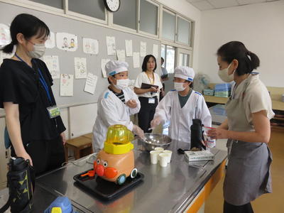 会議後、1年生の給食の様子を観ていただきました。園長先生の来校に喜ぶ子供たちです。