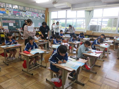 安全な教室に戻った子どもたちは、スクールガードリーダーの講評を聞きます。自分の安全を守るために「いかのおすし」を守ること、防犯ベルが鳴るように整備しておくこと、車に乗せられそうになったら車の進行方向と反対に逃げること等、自分の命を守る方法を教えていただきました。
