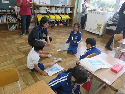 1年生国語「なりきっておんどくしよう」2年生図工「わっかで変身ファッションショー」