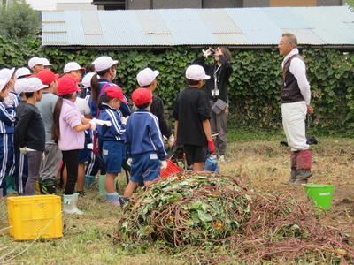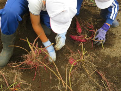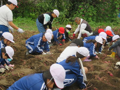 3・4年生が青少推のみなさんにお世話になりながら育ててきたサツマイモを収穫することになりました。1・2年生も加わって、1・2・3・4年生がみんなでサツマイモ掘りをしました。サツマイモがたくさん収穫でき、やきいも集会で焼きいもをつくっていただきます。