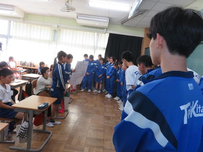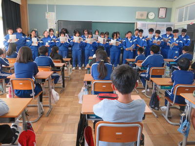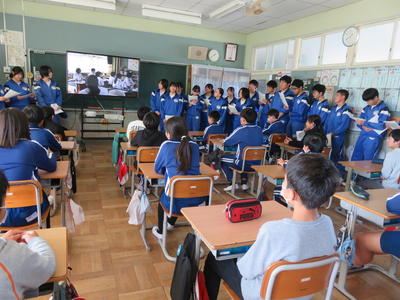 北中3年生が6年生教室を訪問し交流会をしました。北中3年生の1日の学校生活を写真で紹介してもらいました。「COSMOS」を合唱してもらい、中学生の伸びやかな美しい歌声に感動しました。