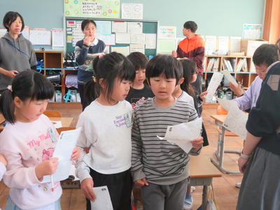 1年生国語「なりきっておんどくしよう」2年生図工「わっかで変身ファッションショー」