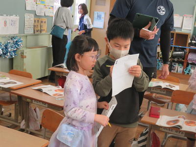 2年生がおもちゃ屋さんをひらいて、1年生を招待しました。2年生の作ったおもちゃは動くおもちゃです。2年生が遊び方や約束を1年生に伝え、1年生は楽しく遊びました。
