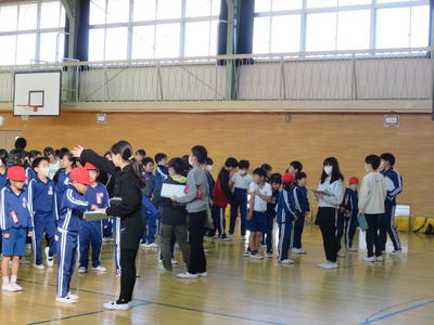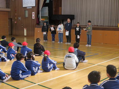 20分休みに体育集会が行われました。小野小オリンピック第2弾「時間走」に向けた練習が始まります。団長から気合いのこもったかけ声がありました。