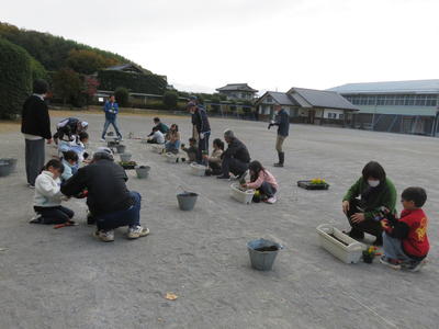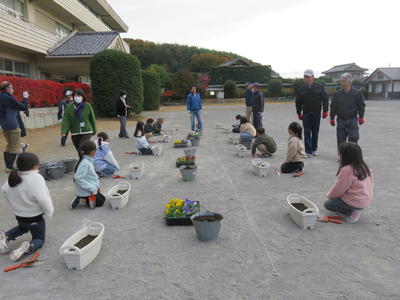 区長さんと地域づくりセンターの皆さんがパンジーをもって来てくださいました。1年生が区長さんに教わりながらパンジーを植えました。