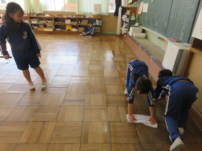 5・6年生が全校のワックスかけをしてくれした。6年生は5年生にワックスのかけ方を教えながら手際よくワックスをかけました。