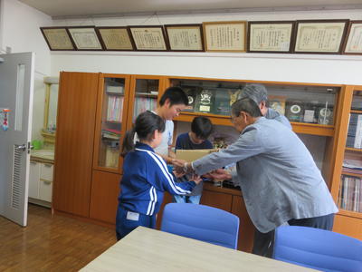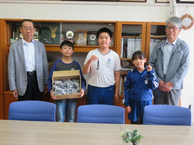 地域づくり協議会よりクマ鈴をいただきました。全校児童分120個のクマ鈴が、区長会長さん副会長さんから、児童会企画委員に手渡されました。明日10月21日、児童会企画委員が各クラスに配ります。子どもたちはこれからこの鈴をつけてクマに遭遇しないよう気を付けて登下校していきます。地域の皆様いつも登下校の見守りをしていただきありがとうございます。これからもどうぞよろしくお願いいたします。