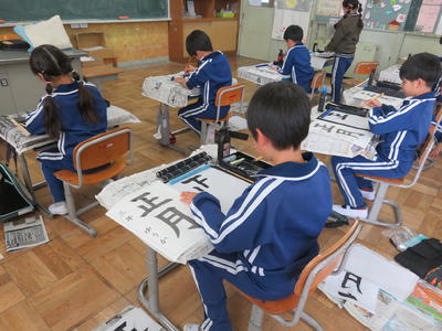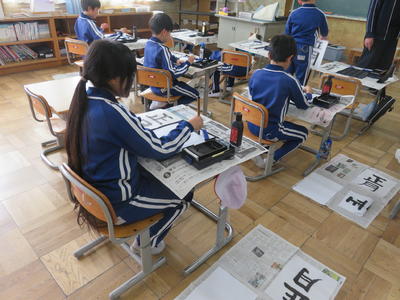 3年生が書き初めをしました。書いた文字は正月。書き初めにふさわしいうれしい言葉です。